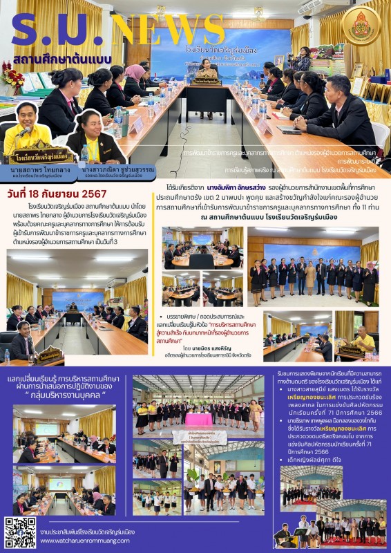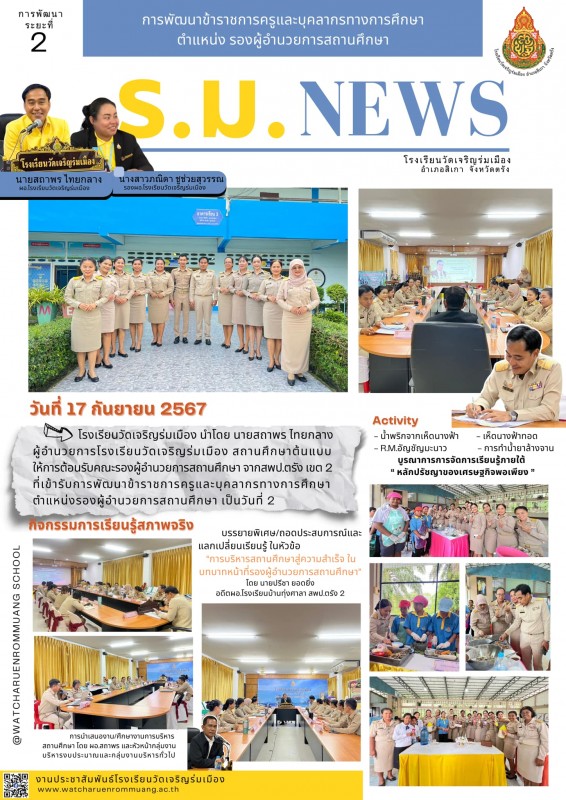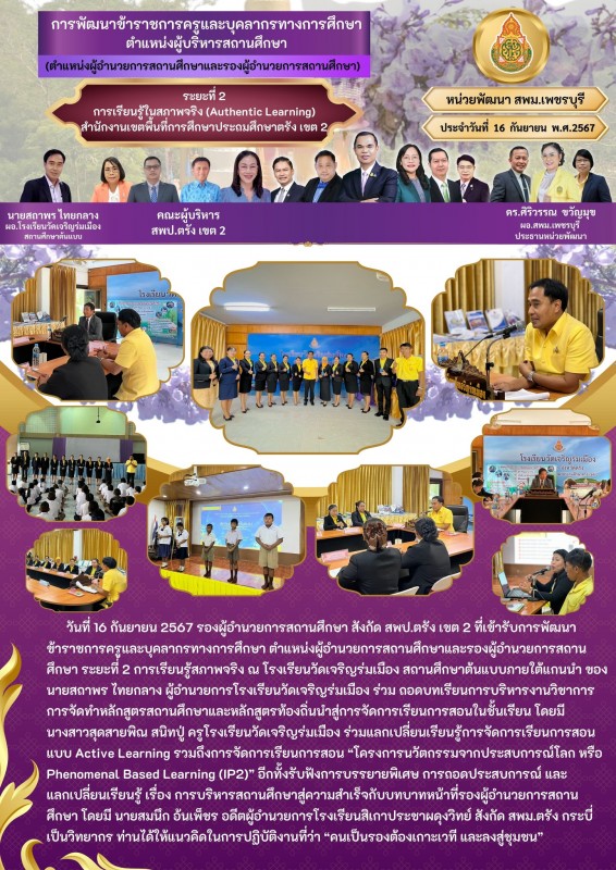 โรงเรียนวัดเจริญร่มเมือง ได้รับมอบหมายสำนักงานเขตพื้นที่การศึกษาประถมศึกษาตรัง เขต 2 และหน่วยพัฒนา สำนักงานเขตพื้นที่การศึกษามัธยมศึกษาเพชรบุรี เป็นสถานศึกษาต้นแบบ ในการพัฒนาข้าราชการครูและบุคลากรทางการศึกษา ตำแหน่งรองผู้อำนวยการสถานศึกษา จากสำนักงานเขตพื้นที่การศึกษาประถมศึกษาตรัง เขต 2 รุ่นที่ 2/2567 ระยะที่ 2 การเรียนรู้สภาพจริง (Authentic Learning) ระหว่างวันที่ 16 - 18 กันยายน 2567 ณ โรงเรียนวัดเจริญร่มเมือง อำเภอสิเกา จังหวัดตรัง